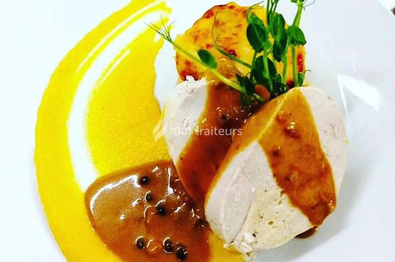 Une entrée, un plat, une assiette de fromages affinés, un dessert, service et vaisselle inclus .