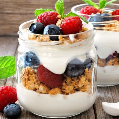 Yaourt, Granola maison, fruits de saison et fruits secs atorréfiés